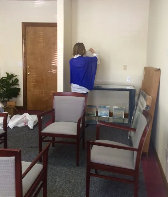 A job like this is so fun because we get to make someone's everyday work environment prettier, more enjoyable, functional, etc. This one in particular was rewarding because we got to know the woman who works here throughout the day and see her excitement over the artwork, furniture, etc. as we brought it in. It's also so satisfying to see a completed product at the end of the day. We always leave NSB installations so grateful for our work!